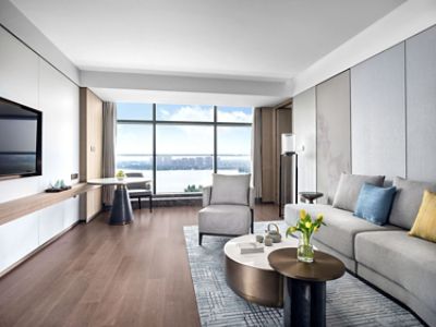 Our spacious One Bedroom Suite, Lake View Room offers unparalleled luxury with stunning views of Dalong Lake from impressive floor-to-ceiling windows.